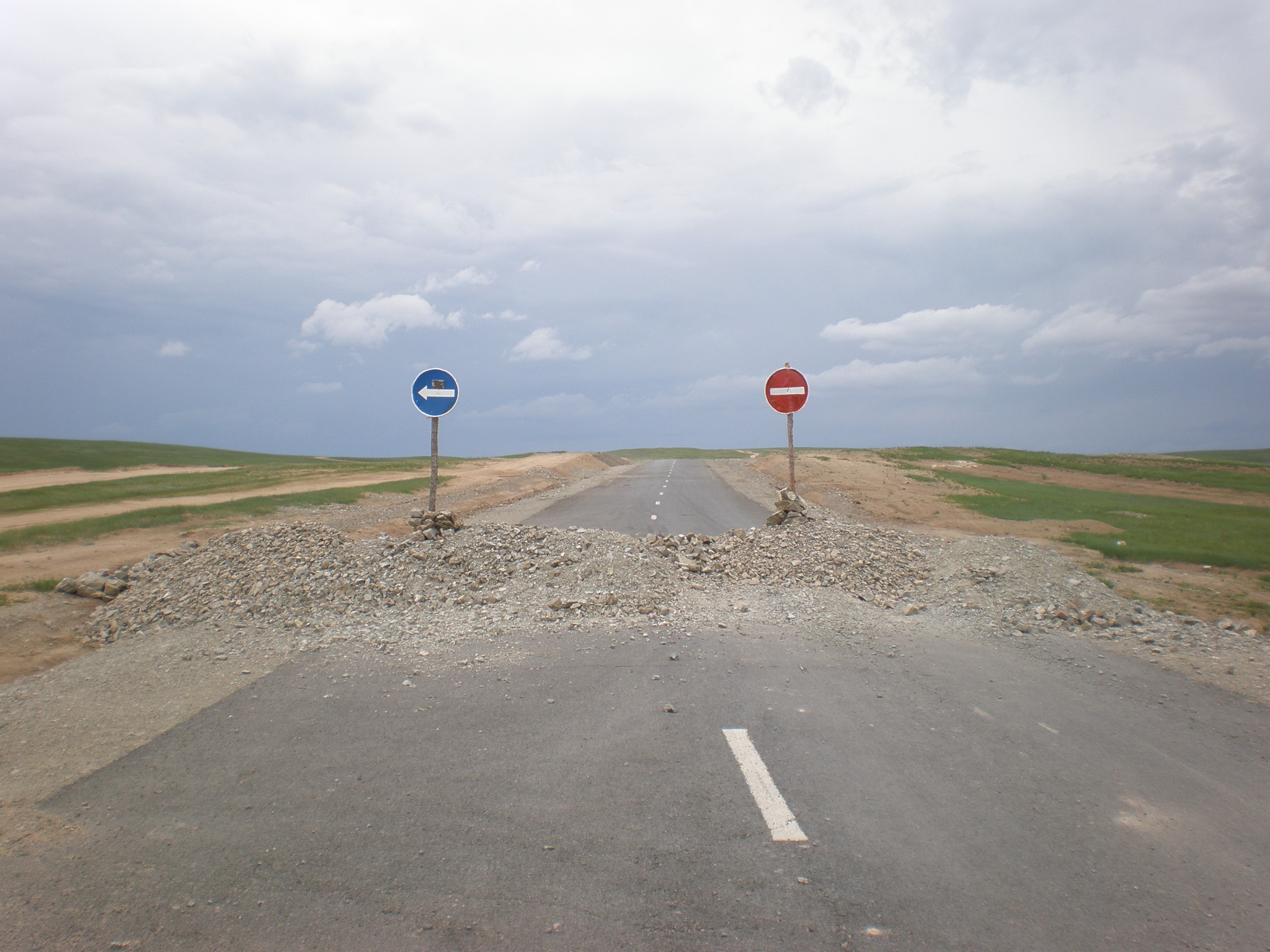 De Mongoolse manier van een nieuwe asfaltweg aanleggen. --- Building a new road Mongolian style.