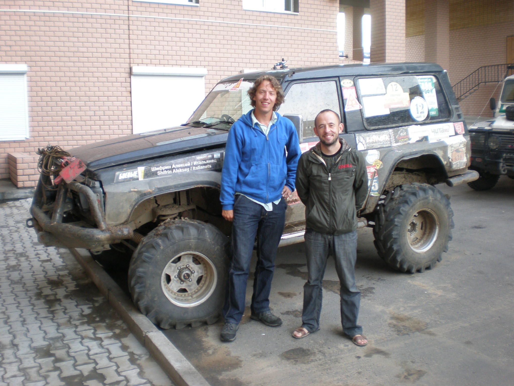 De voorzitter van 4x4 club Diversant in Chita met zijn Nissan Patrol met traktorbanden. --- The president of the 4x4 club Diversant in Chita with his Nissan Patrol with his tractor tires.