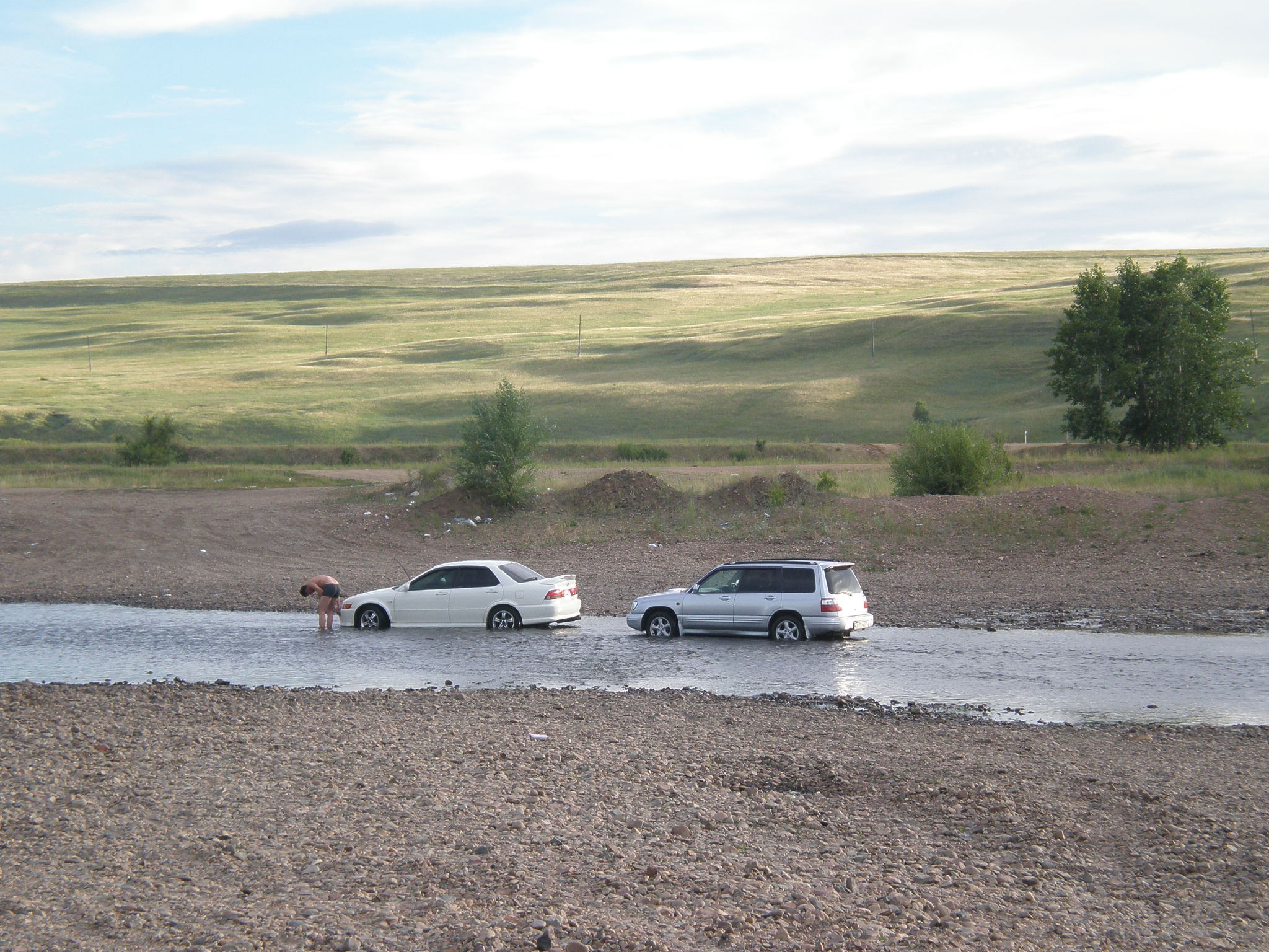 Auto wassen in de rivier: 1 van de favoriete bezigheden van Russische mannen. --- Washing cars in the river. One of the favorite time killers of Russian men.