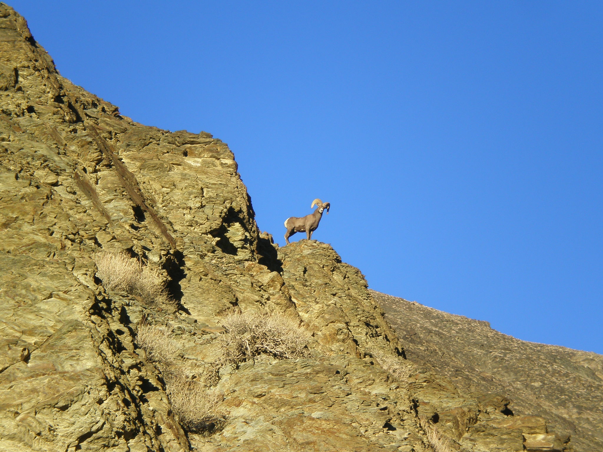 Een dikhoornschaap naast onze kampeerplek. --- A big horn sheep right next to our campsite.