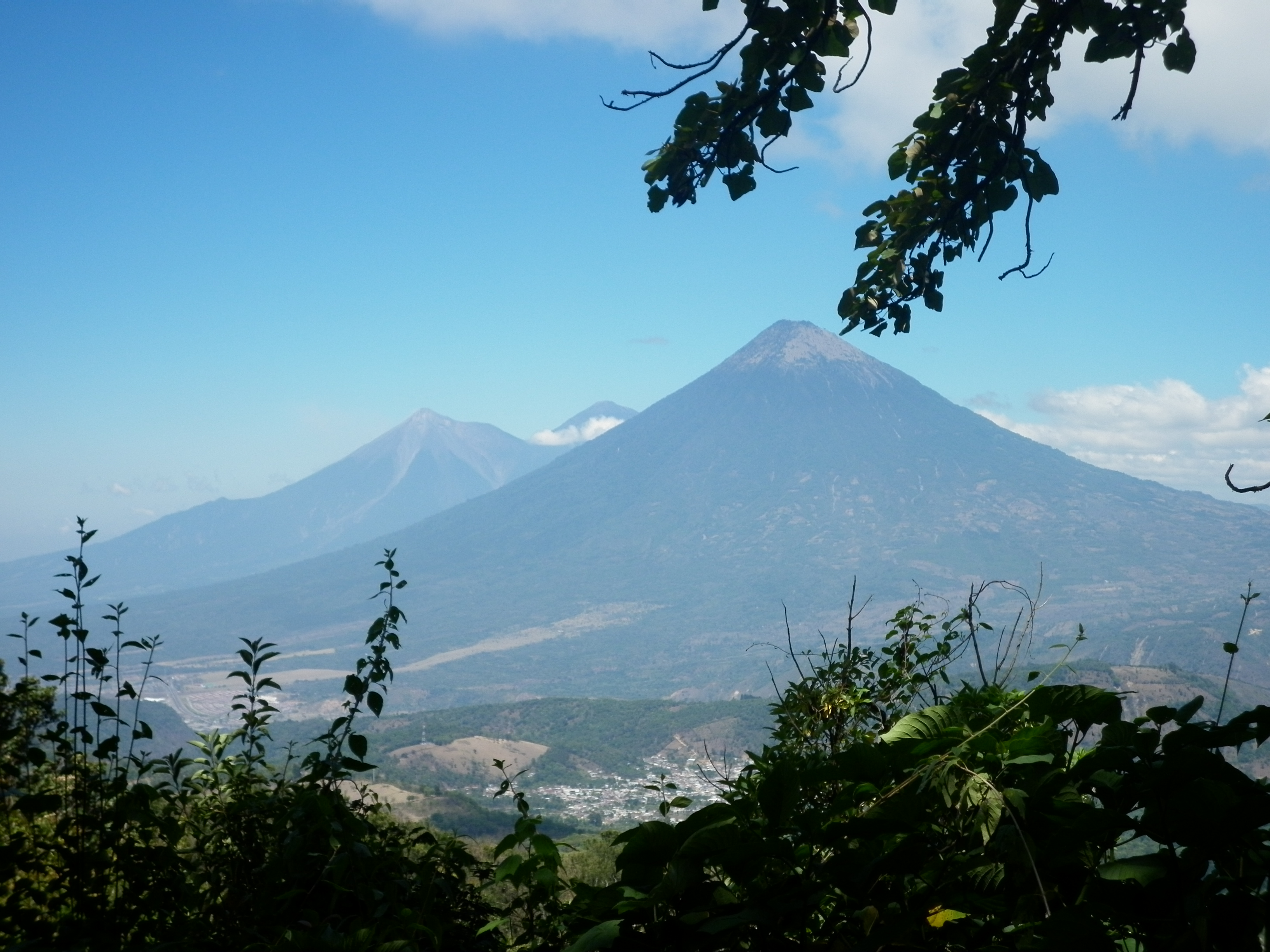 Het uitzicht vanaf vulkaan Pakaya naar de vulkanen Agua, Acatenango en Fuego. --- View from the Pacaya volcano, to the Agua, Acatenango and Fuego vulcanos