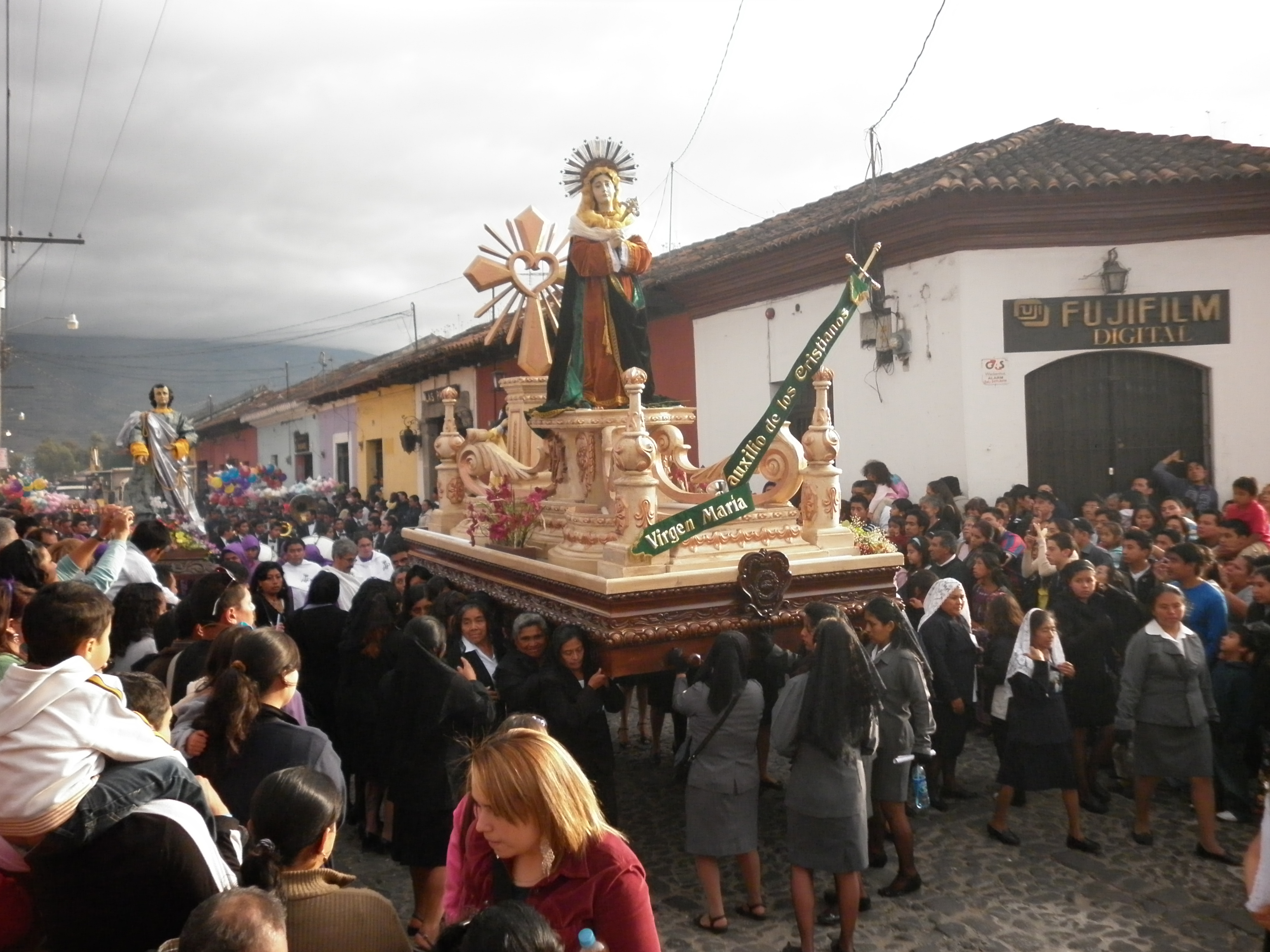 Het Maria altaar wordt gedragen door alleen vrouwen. Op deze foto wisselt een groep vrouwen van positie. --- The Maria is only touched by women. Here you see two groups of women changing position.