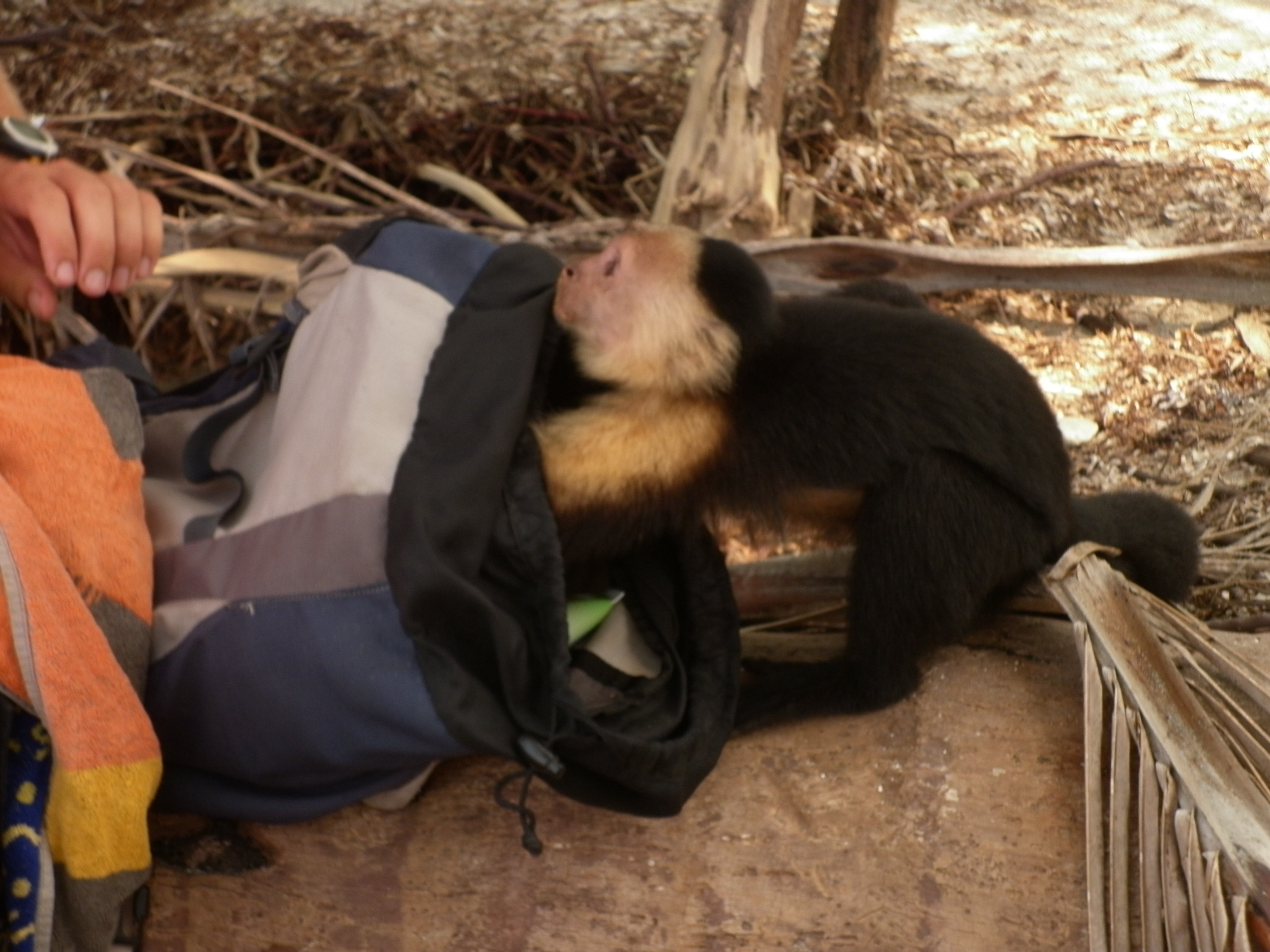 A cappuchin monkey is looking for food, but only finds sunscreen