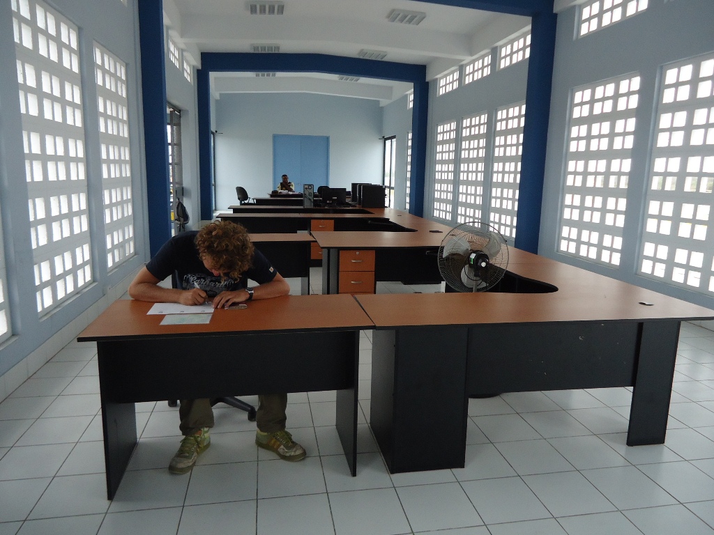 Bram aan zijn huiswerk op de verlaten grens tussen Ecuador en Peru. --- Bram is doing his homework at the border between Ecuador and Peru.