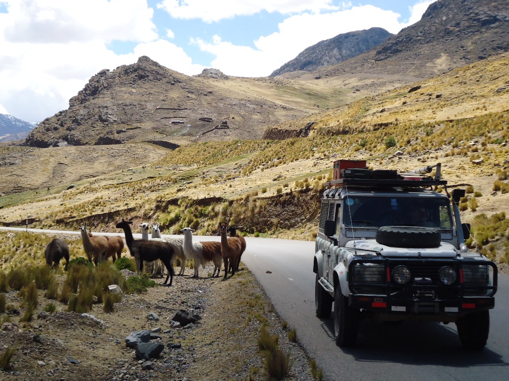 Lama's op de weg vlak bij de top van 4745 meter. --- Lama's om the road close to the summit of 4745 meters.