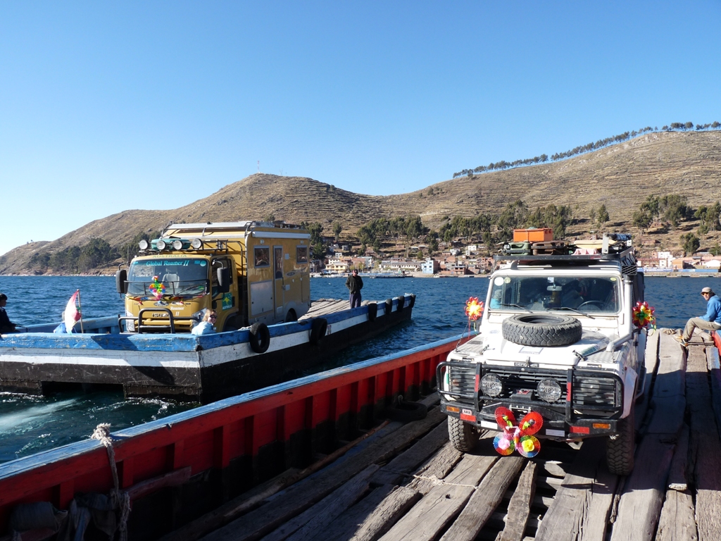 Met de ferry het Titicacameer over. Links de truck van John & Lynda. --- With the ferry across the Titicaca lake. On the left the truck of John & Lynda.
