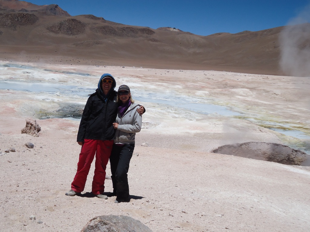 Wandelen tussen thermische geisers. --- Walking in between thermic mudpools.
