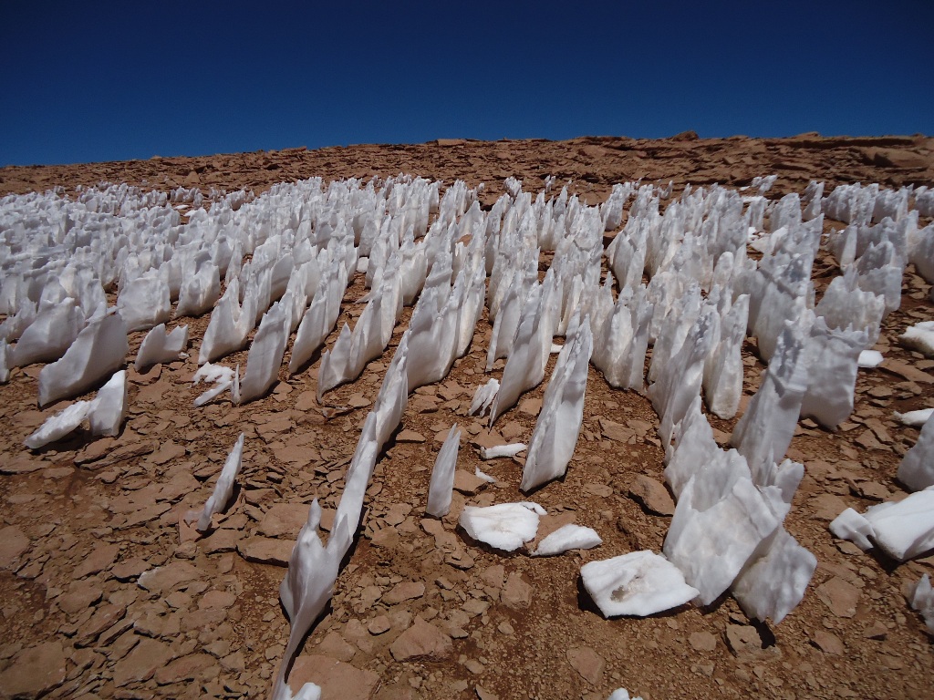 Messcherp ijs op 5020m gevormd door de altijd aanwezige wind --- Razor sharp ice at 5020m formed by the ever present wind.