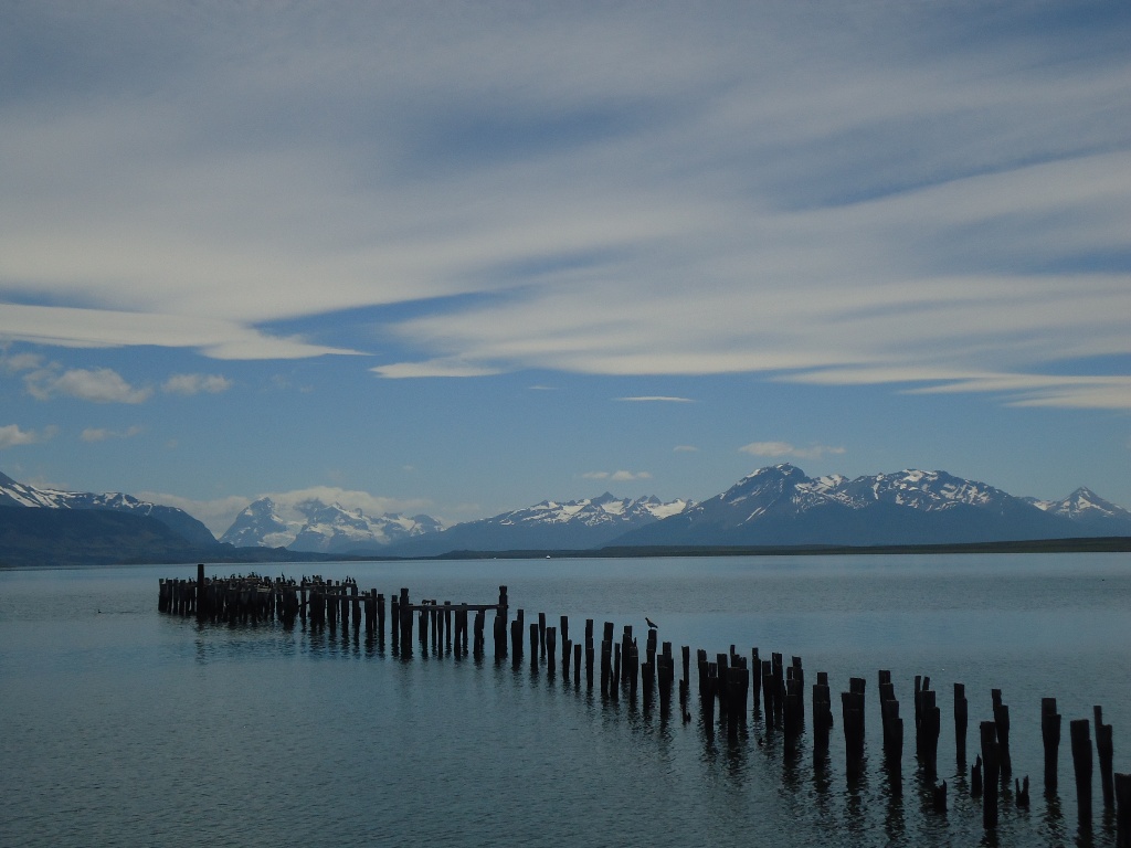 In de ochtend is het nog rustig over de baai bij Puerto Natales, Chili. --- The bay in front of Puerto Natales, Chile, before the wind is picking up.