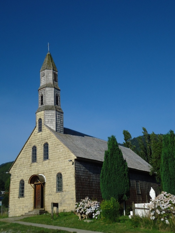 De kerk in Cochamo is een typisch voorbeeld van de Chileense authentieke bouwstijl. --- The church of Cochamo is a typical example of the Chilean architecture.