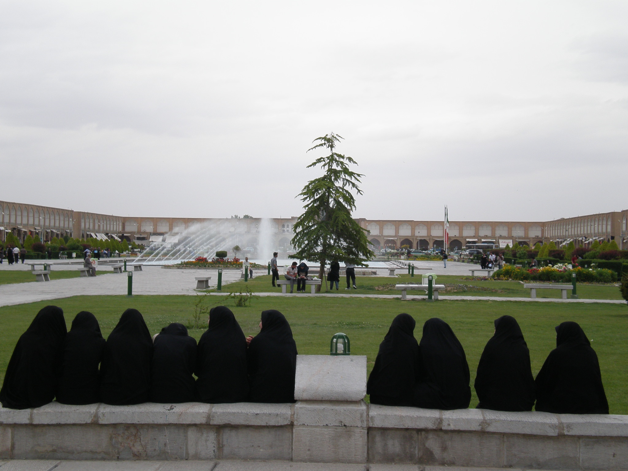 Het Imam Khomeini plein in Esfahan. Een typisch beeld van vrouwen in chador dat wordt afgewisseld met dames met grote kuiven en een hoofddoek die nauwelijks op het hoofd blijft hangen. --- The Iman Khomeini squaure in Esfahan a combination of women dressed in traditional clothing and hairsprayed hair with veil.