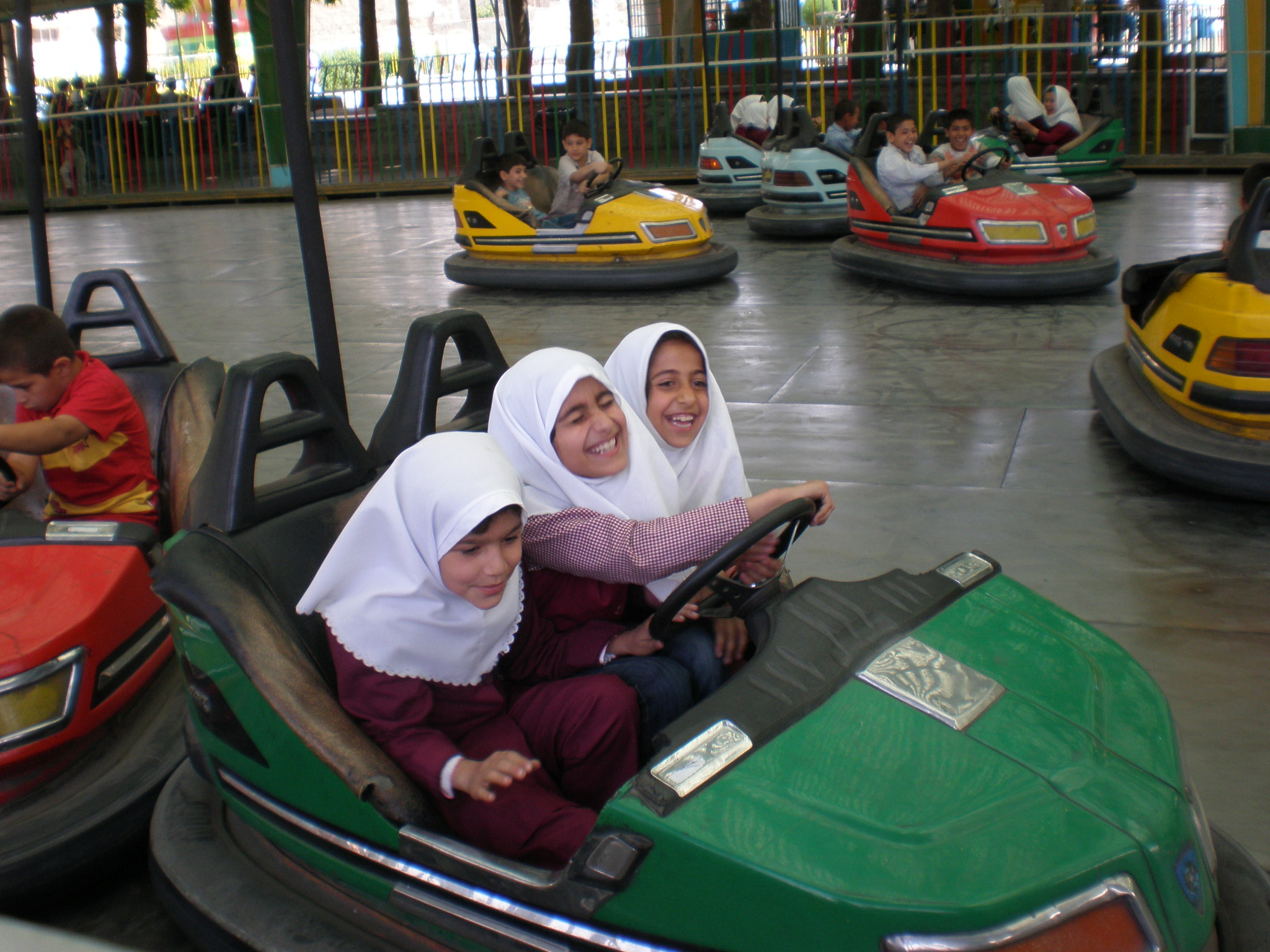 Iraanse schoolmeisjes in de botsauto. --- Iranian schoolgirls in a bumpercar.