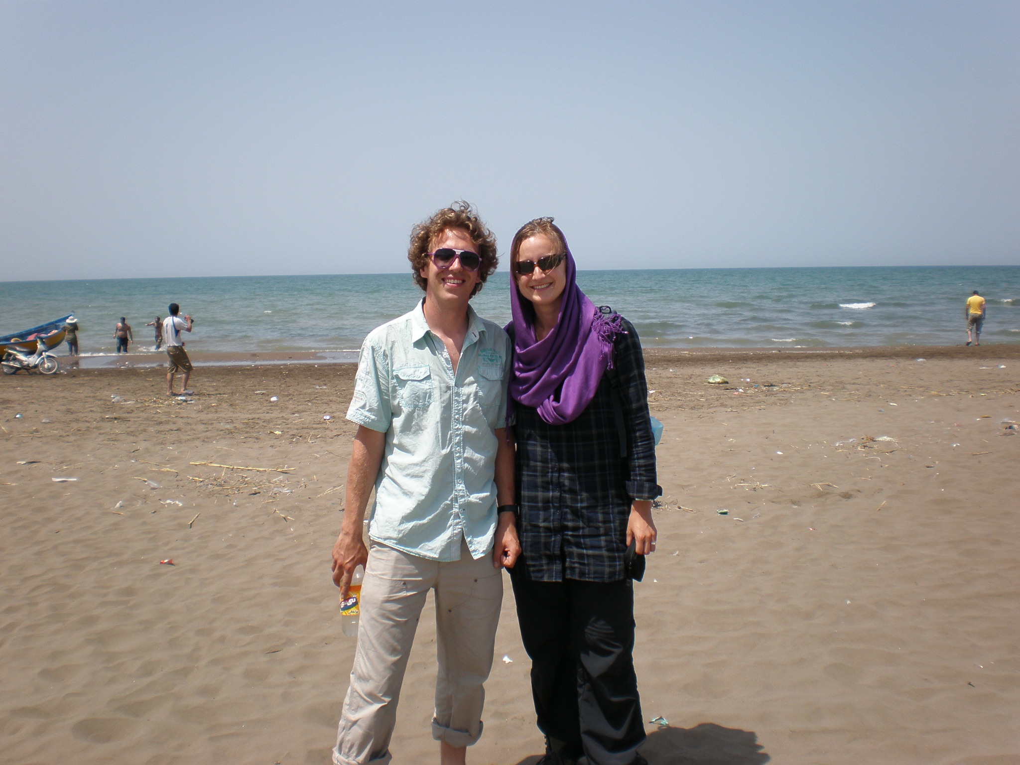 De Kaspische Zee. Ontzettend smerig. Bram heeft gezwommen maar Anouk vond dat te veel gedoe met hoofddoek en kleren. --- A very dirty Caspian sea where Bram swam but Anouk did not want to with veil and clothes on.