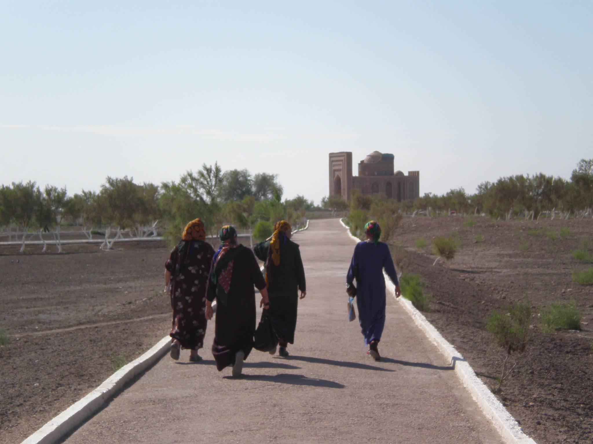 Turkmeense vrouwen in traditionele jurken op weg naar de moskee. --- Turkmen women in traditional garment on their way to the mosque.