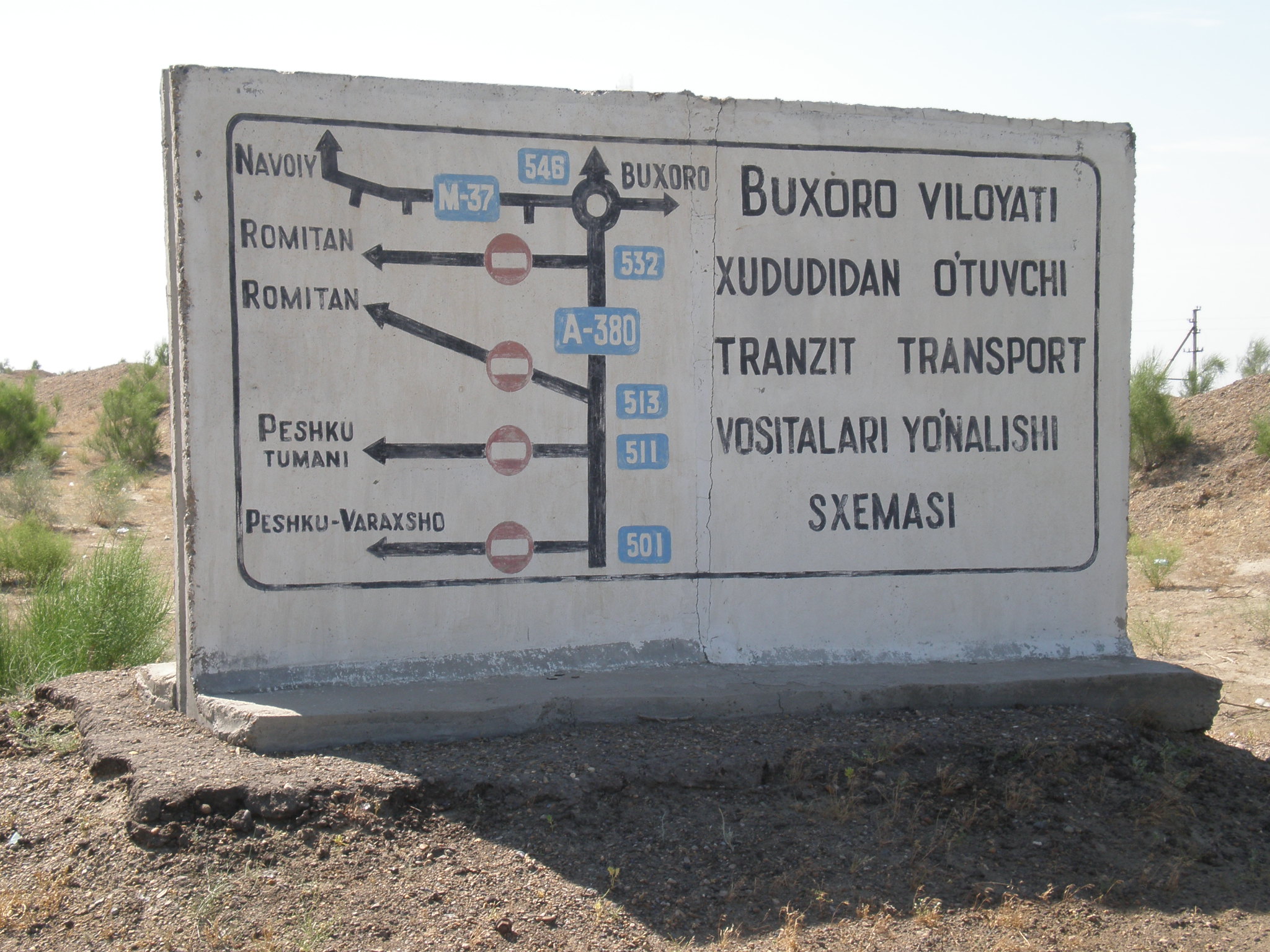 Verkeersborden in Oezbekistan, hier hebben we voor het eerst echt navigatieproblemen. --- Typical Uzbek traffic sign. This is the first time we encounter navigation problems.